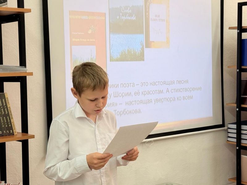 У Степана Торбокова в молодости проявился дар поэта, ему стало тесно в рамках фольклорного соавторства, поэтому он начал писать стихотворения, не скованные фольклорными жанровыми рамками. В своих поэтических произведениях поэт воспроизвёл характерное для шорской культуры уважительное отношение к природе как к живой целостности. Деревья, горы, ветер, животные у него умеют чувствовать, переживать, они имеют свою судьбу. Учащиеся школы-интерната прочли понравившиеся им стихотворения шорского поэта, которые они подготовили вместе с библиотекарем к мероприятию.