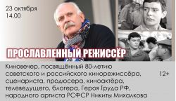 23 октября в 14.00 посетителям Кузбасского инклюзивного коммуникационного центра досуга Специальной библиотеки Кузбасса для незрячих и слабовидящих будет представлен киновечер «Прославленный режиссёр», посвященный 80-летию советского и российского кинорежиссёра, сценариста, продюсера, киноактёра, телеведущего, блогера, Героя Труда России, народного артиста РСФСР Никиты Михалкова.