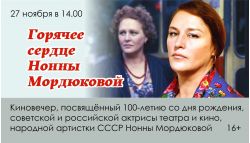 27 ноября в 14.00 посетителям Кузбасского инклюзивного коммуникационного центра досуга Специальной библиотеки Кузбасса для незрячих и слабовидящих будет представлен киновечер «Горячее сердце Нонны Мордюковой», посвященный 100-летию со дня рождения советской и российской актрисы театра и кино, народной артистки СССР Нонны Викторовны Мордюковой.