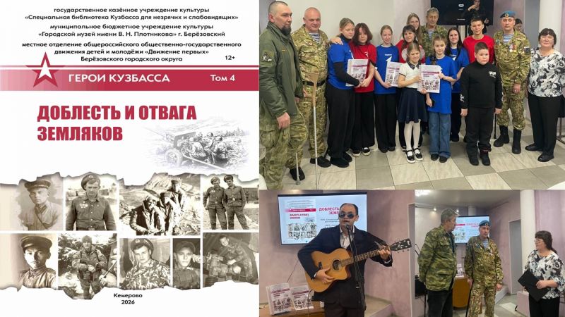 19 февраля сотрудники Специальной библиотеки Кузбасса для незрячих и слабовидящих провели презентацию адаптированного издания «Доблесть и отвага земляков» серии книг «Герои Кузбасса». Мероприятие, приуроченное ко Дню защитника Отечества, проведено в Городском музее имени В.Н.Плотникова г.Берёзовский с участием соавторов издания, ветеранов Афганской войны и специальной военной операции, представителей городских общественных организаций г.Берёзовский. Творческую поддержку презентации оказали самодеятельные вокалисты Дворца культуры Всероссийского общества слепых г.Кемерово.