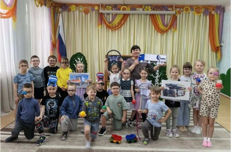 Дети познакомились с фирменной эмблемой Камаза со скачущим конём-аргамаком, олицетворяющим скорость, мощь, выносливость, целеустремлённость и верность традициям.