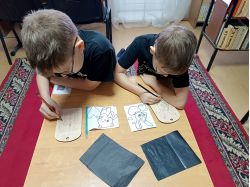 Посмотрели обучающий урок о технике росписи по дереву акриловыми красками. Перевели изображение с помощью трафарета на деревянную досочку. С помощью акриловых фломастеров воплотили свои идеи в жизнь. Так получились яркие, красочные поделки, раскрывающие индивидуальность их авторов.