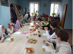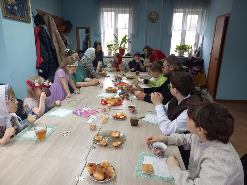 Праздничное мероприятие завершилось совместной трапезой: родители накрыли для всех присутствующих щедрый стол с угощениями. В начале встречи все вместе дружно пропели тропарь Пасхи, объединённые общей радостью и верой.