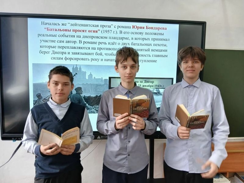 В ходе мероприятия, учащиеся познакомились с презентацией о творчестве писателей-фронтовиков: Виктора Некрасова, Юрия Бондарева, Григория Бакланова, Бориса Васильева и других представителей лейтенантской прозы.