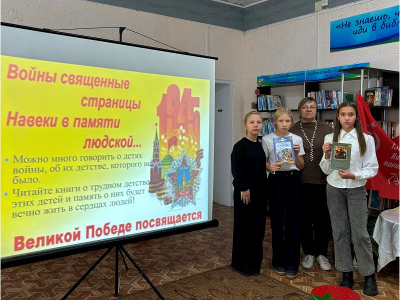 Сотрудница библиотеки Светлана Анатольевна Акимова напомнила гостям о праздновании 80 – летия Победы в Великой Отечественной войне, сколько испытаний выпало на долю советских людей. Известно, что война затронула каждого, не обошла стороной ни женщин, ни стариков, ни детей. Погибло в войну 13 миллионов детей, у кого-то отняла жизнь, у кого-то родителей, у многих детство. В ходе литературной гостиной «Война и дети», присутствующие гости познакомились с литературой военных и послевоенных лет, стихотворениями, написанными для детей и о детях, авторами которых являлись А. Т. Твардовский, К. М. Симонов, С. Я. Маршак, В. Катаев, А. Митяев и другие.