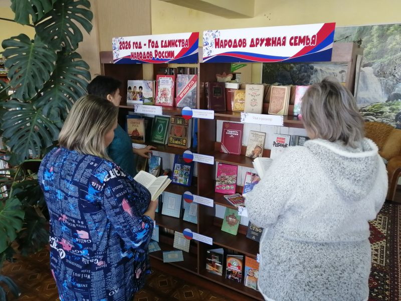 В Чумайской модельной библиотеке рамках объявленного президентом Российской Федерации Владимиром Владимировичем Путиным 2026 год- Годом единства народов России для посетителей библиотеки оформлена выставка «2026 - Год единства народов России. Народов дружная семья».