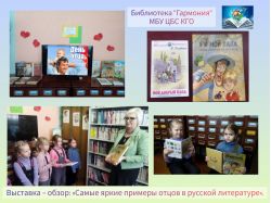В целях укрепления института семьи и повышения значимости отцовства в воспитании детей, в Библиотеке «Гармония» МБУ ЦБС КГО организована выставка – обзор «Самые яркие примеры отцов в русской литературе». Выставка представляет произведения русской художественной литературы с различными образами отцов. Например, Леонид Андреев в рассказе «Ангелочек» показал высокие отцовские чувства. Александр Грин в рассказе «Новогодний праздник отца и маленькой дочери» описывает добрые взаимоотношения отца и дочери. А перечитав великое произведение Льва Толстого «Война и мир», можно вспомнить старого графа Ростова и образ авторитетного отца князя Болконского.