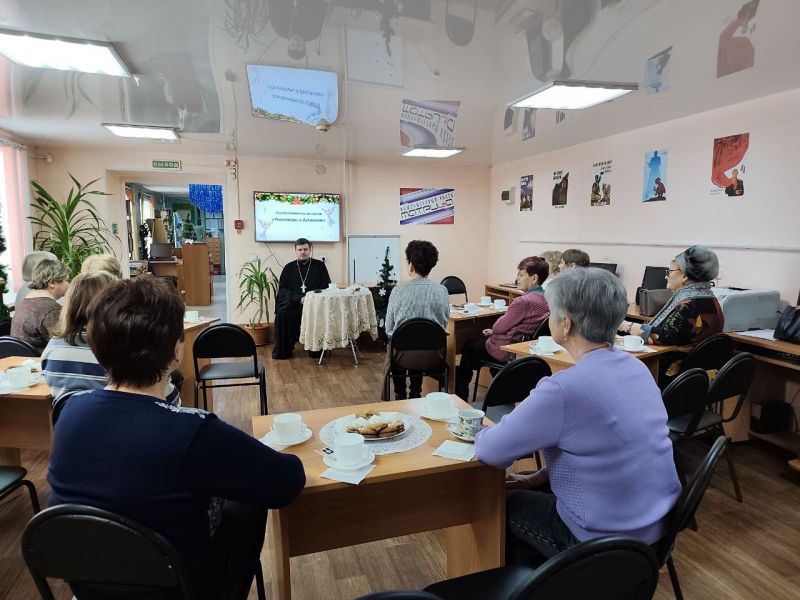 9 января в Центральной библиотеке в рамках циклы «Разговоры о духовном» состоялась рождественская встреча жителей со священником Храма Покрова Божией Матери отцом Даниилом. Мероприятие прошло в душевной теплой атмосфере за чайными столами.