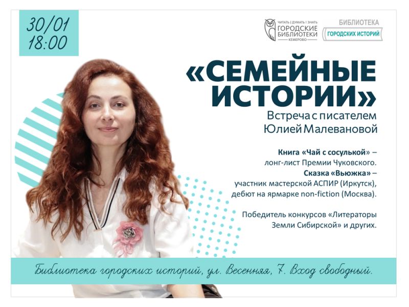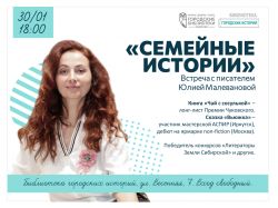Приглашаем 30 января в 18:00 в Библиотеку городских историй (ул. Весенняя, 7) на тёплую встречу с Юлией Малевановой. Юлия Сергеевна – автор книг, которые читает вся семья. Ее книги интересны и детям, и взрослым: родителям, бабушкам и дедушкам, педагогам и психологам. Эти книги – мост между поколениями, бережный разговор о важном.