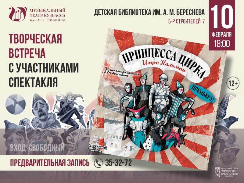 10 февраля в 18:00 в стенах Детской библиотеке им. А. М. Береснева (б-р Строителей, 7) пройдет творческий вечер с ведущими солистами Музыкального театра Кузбасса, занятыми в спектакле «Принцесса цирка».