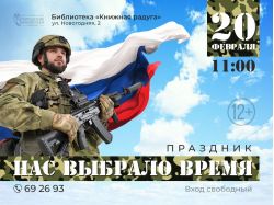 20 февраля 2026 года в 11:00 в библиотеке «Книжная радуга» (ул. Новогодняя, 2) состоится праздник «Нас выбрало время», приуроченный ко Дню защитника Отечества.