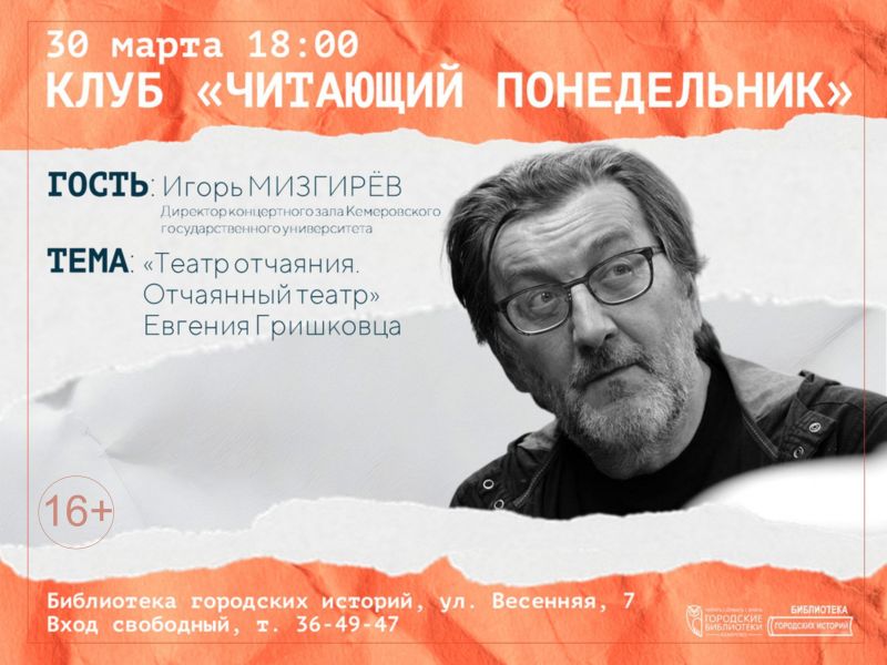 Поможет в этом специальный гость – Игорь Мизгирев, директор концертного зала Кемеровского государственного университета. Его профессиональный взгляд изнутри театральной и концертной жизни позволит взглянуть на книгу Гришковца под неожиданным углом.
