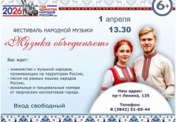 1 апреля 2026 года в 13:30 в Библиотеке им. Н. В. Гоголя (пр. Ленина, 135) состоится фестиваль народной музыки «Музыка объединяет», приуроченный к Году единства народов России.