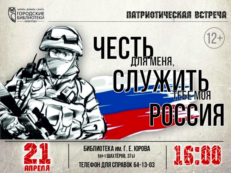 21 апреля 2026 года в 16:00 Библиотека им. Г. Е. Юрова (пр-т Шахтёров, 37Б) приглашает горожан принять участие в беседе «Честь для меня, служить тебе моя Россия». Встреча пройдёт в формате живого общения с участником специальной военной операции, Героем России.