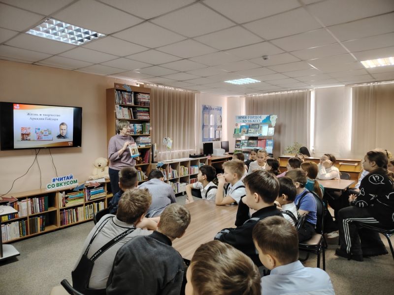 Библиотекарь рассказала о жизни и творчестве известного писателя. Познакомились с произведением писателя «Тимур и его команда». Детям было интересно узнать, что именно эта книга положила начало тимуровскому движению, которое существует и сейчас. Называется оно волонтерское движение. Ребята решали литературный кроссворд по произведению, отвечали на вопросы викторины, угадывали героев по картинкам.
