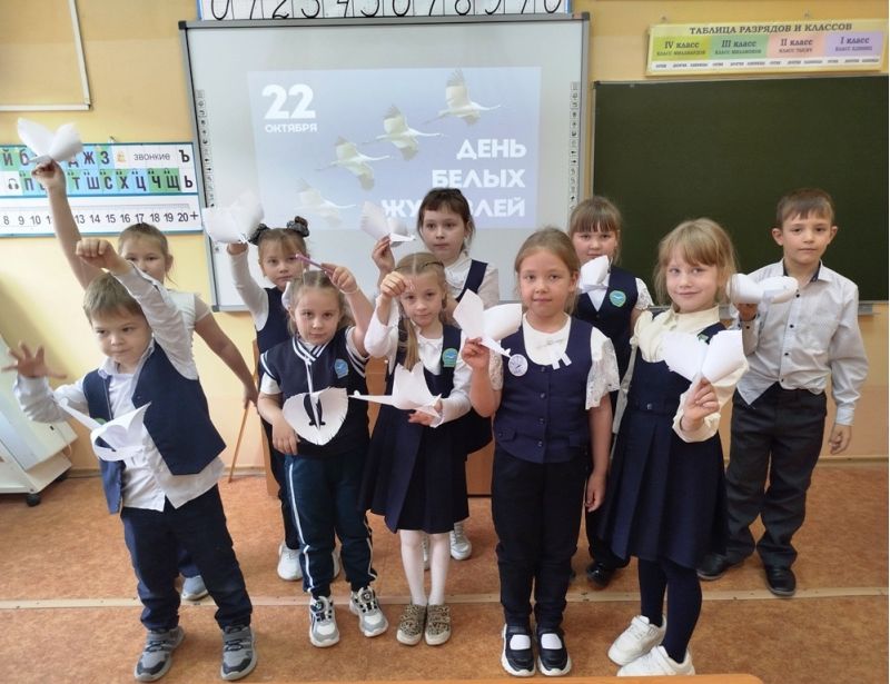 20 октября сотрудник детской библиотеки для первоклассников школы № 2 провела акцию памяти «Летят в бессмертье журавли» посвященную Дню белых журавлей. В этот день чтят память погибших в войнах солдат и прославляют дружбу народов. Библиотекарь рассказала об истории появления праздника, о больной японской девочке Садако, которая была безнадежно больна после облучения во время взрыва атомной бомбы, но очень хотела жить и чтобы выжить, мастерила бумажных журавликов. Дети совершили виртуальное путешествие по странам и городам, где памятники «Белым журавлям» установлены, как призыв к миру, милосердию и добрососедству. В завершение ребята дружно делали из белой бумаги символ праздника – Белых журавлей.
