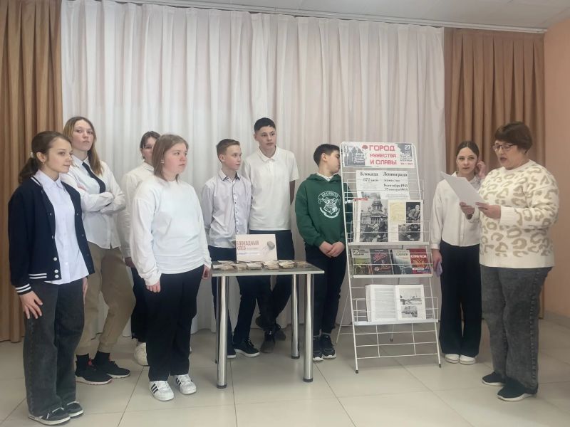 27 января – день воинской славы России. День полного освобождения Ленинграда от фашистской блокады. Модельная библиотека совместно с Домом культуры с.Красного провели патриотическую программу «Самая трагическая страница в истории Ленинграда - блокада» и акцию «Блокадный хлеб» для 7 «А» класса Краснинской средней школы. 872 дня длилась блокада, более миллиона человек погибли в эти страшные для города дни, но не смотря ни на что, город жил своей жизнью: работали заводы, школы, театры, ходили трамваи. Гитлер хотел стереть с лица земли Ленинград, называл его мертвым городом. Но великая сила духа советского народа смогла победить все невзгоды и выстоять городу. В этот день ребята познакомились с книжной выставкой «Город мужества и славы». Библиотекарь рассказала о двух книгах «Великая Отечественная война. 1941-1945 гг. Том 2» и «Главные документы Великой Отечественной войны: фотоальбом». Посмотрели фотографии тех лет. Нельзя не восхищаться мужеством людей, которые жили в Ленинграде в такое суровое время. Наш район связан с блокадой Ленинграда. В селе Красном в годы войны располагался детский дом, в котором воспитывались более 100 детей Ленинграда. Затем почтили память погибших в акции «Блокадный хлеб». Ребята получили блокадный паек и листовку с информацией, сколько грамм он составлял для разных категорий жителей Ленинграда. И завершилась встреча просмотром социального ролика «Сокровище времен блокады» и художественного фильма о Ленинграде. Будущее поколение должно знать о своей истории, о трагедиях своей Родины, чтобы любить ее и беречь.