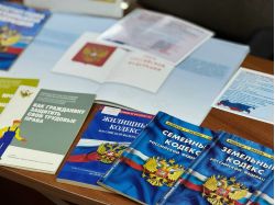 На полках — не только сам текст Конституции, но и книги по праву, о государственной символике (герб, флаг, гимн), а также об истории создания основного закона.