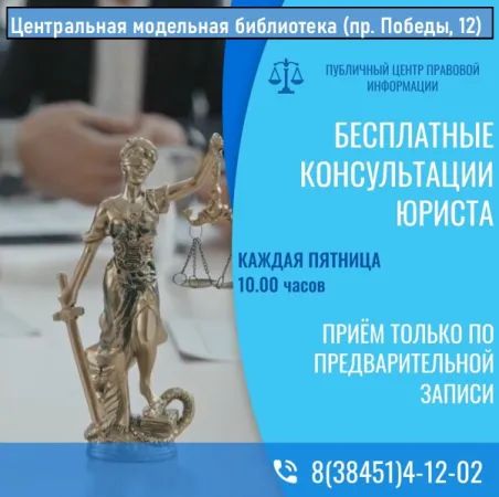 а также получить бесплатные консультации юристов по предварительной записи по +7 (38451) 4-12-02